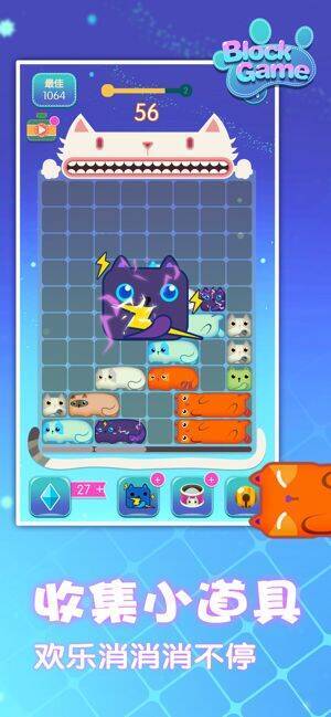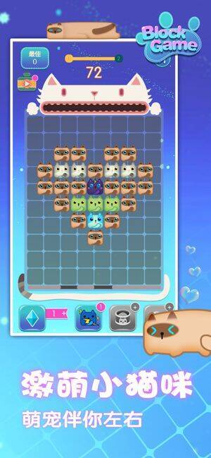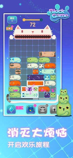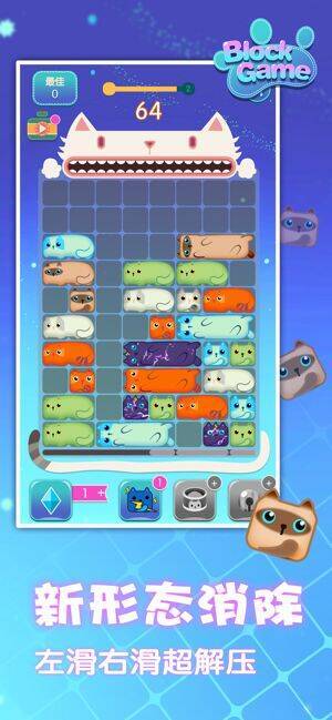 《一起消方块》是一款超萌的消除手游,玩法简单,左滑右滑轻松消除,水平移动方块以填满并清除整行。还有各种效果出色的道具助你克服难关。游戏采用Q萌的猫咪主题打造,融入诸多可爱玩法元素,定能为你带来全新玩法和游戏乐趣。主要角色是小猫,小猫种类繁多,毛色图案各异,你能在游戏中见识到更多品种的猫。