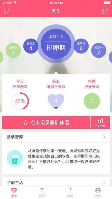 【备孕怀孕周期记录】记录备孕期间的生理数据,通过科学算法准确推算姨妈期、排卵期等生理周期和怀孕几率,在最佳受孕日提醒用户备孕。【全面记录生理指标】拥有更全面的记录页面,可记录大姨妈、排卵、感冒、熬夜等备孕相关信息,随时推送贴心提示。【备孕知识库,权威医学专家团队】打造备孕知识大数据库,涵盖怀孕备孕知识、经期调理等内容。还有权威医学专家定期撰稿,推送专业建议。