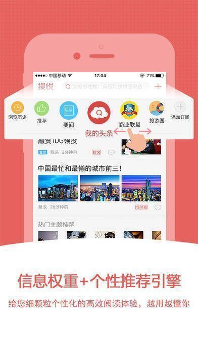 【我的头条】运用大数据算法,采用领先的“信息权重 + 个性化推荐引擎”,既能满足用户细颗粒度的个性化阅读需求,又能提供高效获取信息的优质阅读体验。在信息泛滥的当下,搜悦让用户拥有专属的资讯头条,只看自己订阅且关心的内容。