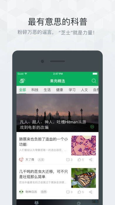 3、每日为您推荐热门果壳文章,让您随时随地获取新鲜、有价值的生活知识和科技资讯。此外,您还能看到果壳编辑精心挑选的来自壹读、VICE、微在等数十家媒体风格各异但调性相近的精彩内容;