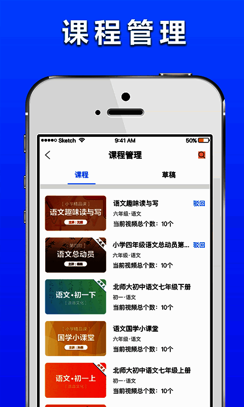 4、课程管理:视频课程分享,让更多学生可以随时随地学习我的课程。