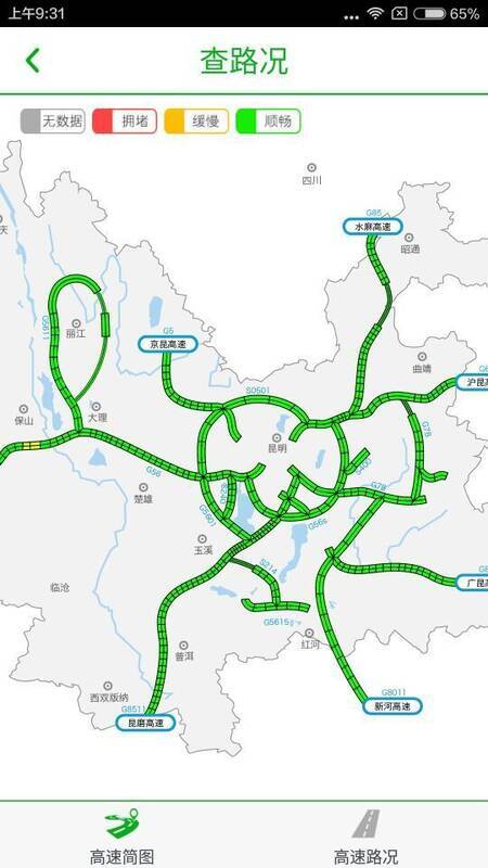 云南高速通app的为市民走高速提供实时路况和服务信息,让你春节走高速更畅通,寻找美食更快,不再因担心拥堵而心慌慌!入APP,点击“查路况”,全面高速路况简图让你一览全省高速路况。