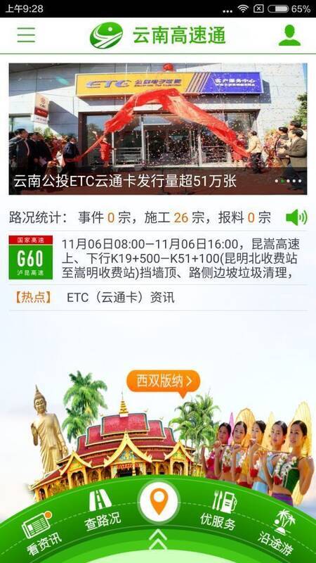 云南高速通app可实时播报全省高速公路交通事件、施工信息、出行提示等信息。现在主要是提供云南公投的高速公路服务信息,目前正在通过省交通运输厅协调其他高速公路的情况,未来逐步将全省的高速信息全部纳入。