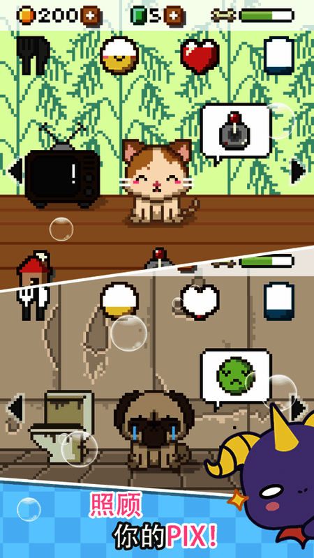 养宠物已经是大多数人的爱好,养只宠物可以陪伴自己,让自己不再孤单。《Pix我的虚拟宠物》是一款像素发个的模拟宠物养成游戏,玩家在游戏中需要养成自己的宠物,照顾自己宠物的,需要把他们照顾的好好的。在他们饥饿的时候给他们食物,并为他们清洁。