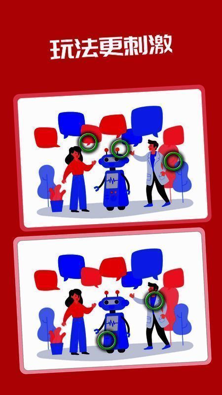 一起找茬游戏是一款十分轻松休闲的找不同游戏,这款游戏采用的是最经典的找茬游戏玩法,不过更多的是考验玩家的操作,主要还是考验相关的眼里以及反应,玩起来十分的简单,操作起来方便。设置5个不同的点,睁大眼睛去看看,找出所有的不同之处就能完成闯关,顺利的进入下一关。