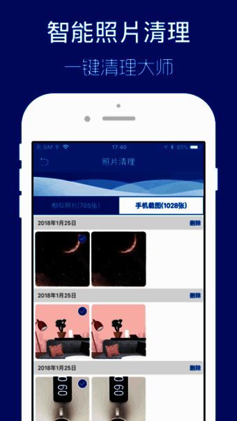 可随时开启App查看手机空间使用状况,及时清理相似照片和手机截图。