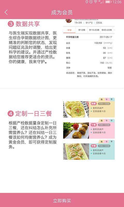 一是按时提醒产检,用有趣的孕检漫画让你提前掌握产检项目和注意事项;二是提供孕期饮食指导,分析食物营养,每周推荐多种美味食谱及烹饪方法;三是进行实用的孕期知识科普,消除孕期疑惑,助力健康度过孕期。