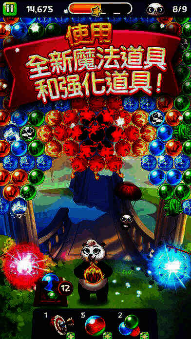 游戏中,邪恶狒狒绑架了珍贵的熊猫宝宝并困在丛林,你要帮熊猫妈妈消除同色泡泡,击败狒狒,送宝宝回家。需精心策划,利用好每个泡泡,一路闯过越来越难的关卡,借助元素之力完成任务,泡泡爆破魔法道具组合使用威力更大。