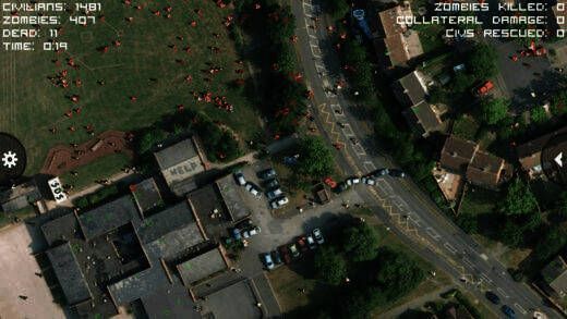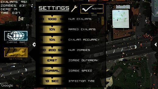 在游戏里,能设定僵尸数量、市民持有武器数量、警察数量以及各自的移动速度。值得一提的是,游戏地图采用了Google电子地图的实景模式,说不定你拼命保卫的住宅就是自己家。游戏最终结果有三种:僵尸被全歼、僵尸占领城市或僵尸与人类对峙。
