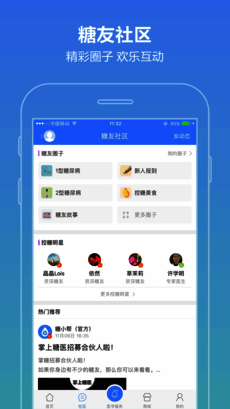 糖友圈子可全国糖友交流;欢乐互动一起抗病魔;有大量医生、医院、资讯等资源;健康商城供应多样商品;能线上查体检报告;实时监控血糖变化;收集海量健康资讯。