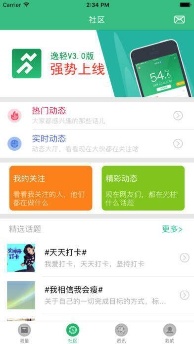 逸轻app可配合逸轻体脂秤使用,提供体重、水分、BMI等各类信息,用户能在手机端实时查看数据,掌握身体动态,同时还能学习健康与减肥资讯。