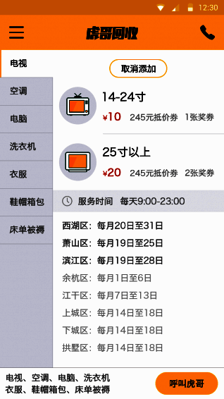 虎哥回收app是一个实用的回收平台。以前回收热水器、电冰箱等物品,都得推着车子四处吆喝,现在有了虎哥回收app,只需一键呼叫回收,就能让虎哥帮忙处理不需要的旧衣服等物品。