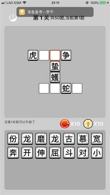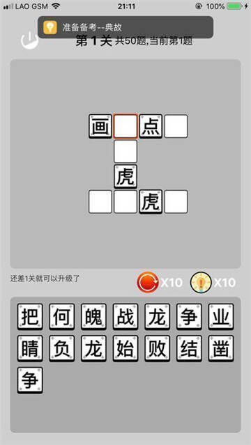 3. 只有横竖都能构成现存成语,才能成功挑战当前关卡。