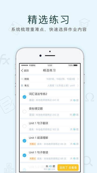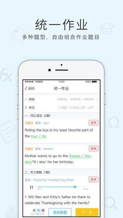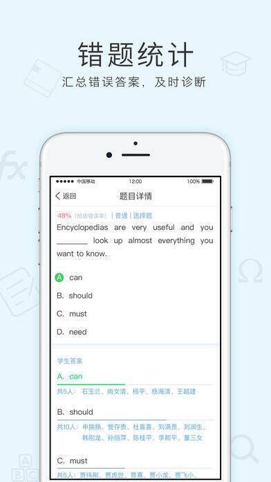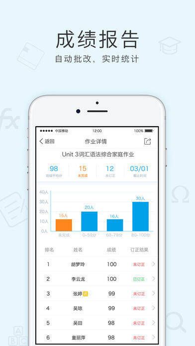 老师能在手机或电脑上,将精心准备的精选练习布置为作业,还能自由组合作业内容,以适应不同学习程度的学生。学生完成作业后,系统自动批改,并要求学生订正错题。同时实时生成成绩分析报告,让老师及时掌握学生的作业完成情况,了解学生的薄弱知识点,大大减轻老师的工作量。