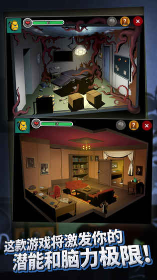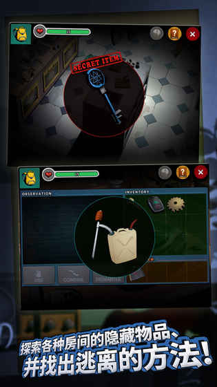 这是一款非常出色的游戏,玩家在玩的过程中能提升观察能力、灵活大脑。它与以往的密室逃脱游戏不同,规定了血量,扣完需重头再来,且每个板块有四样隐藏物品,部分关卡需用隐藏物品解锁。