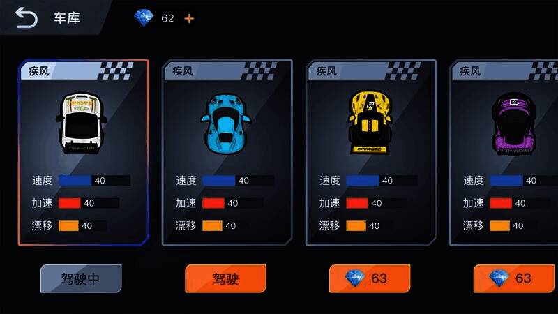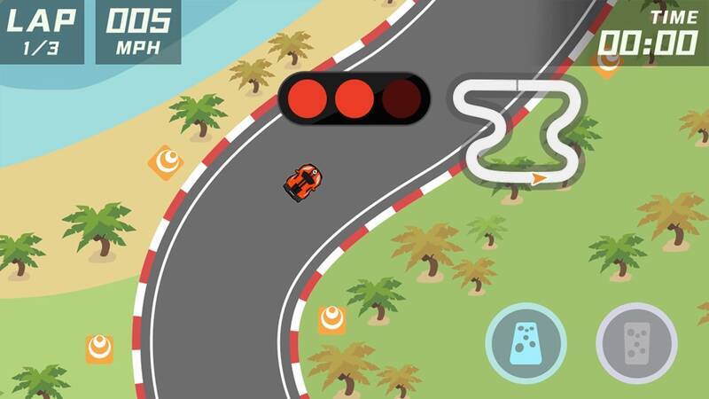 玩家以第三俯瞰视角游戏,选好车辆后进入赛道,体验高速移动的畅快,在弯道尽情漂移,享受速度疾驰,控制车辆帅气前行。