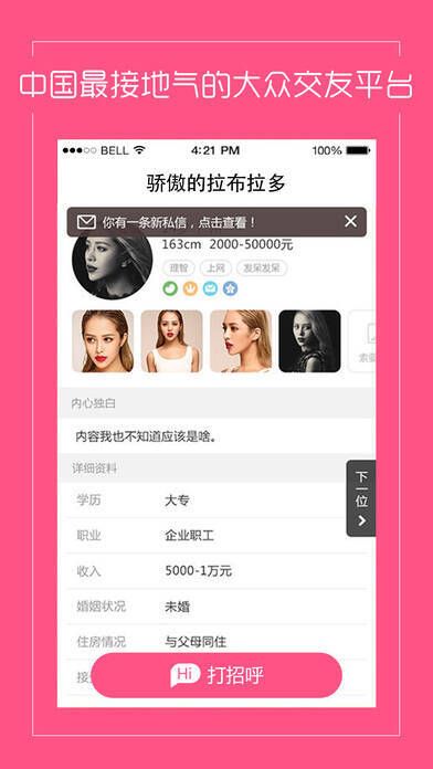 2、它具备完善的实名认证机制,让相亲更安心,交友更安全。作为中国以同城、初爱、相遇为理念的大型婚恋交友平台,所有婚恋交友信息都经过严格审核,为用户打造高品质的同城婚恋交友环境。