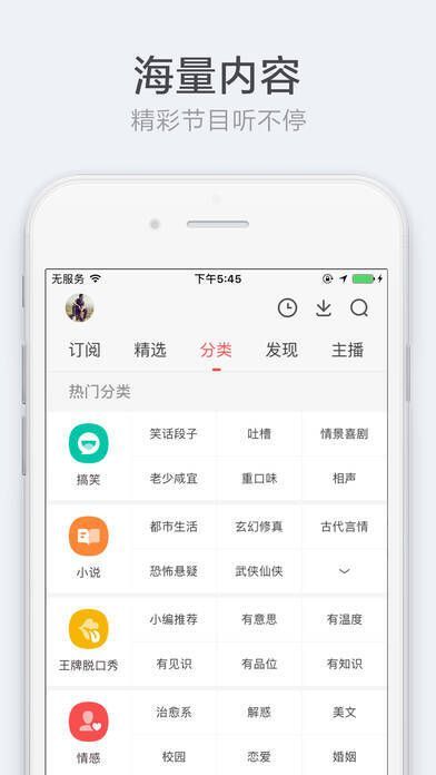 段子手脱口秀,是乘车排队时解闷的开心利器;听书社区,汇聚海量玄幻与网络有声小说;英语电台,助你练就新东方英语;财经新闻电台,解放双眼,聚焦今日头条;儿童电台,田亮刘烨陪宝宝听儿歌、故事。