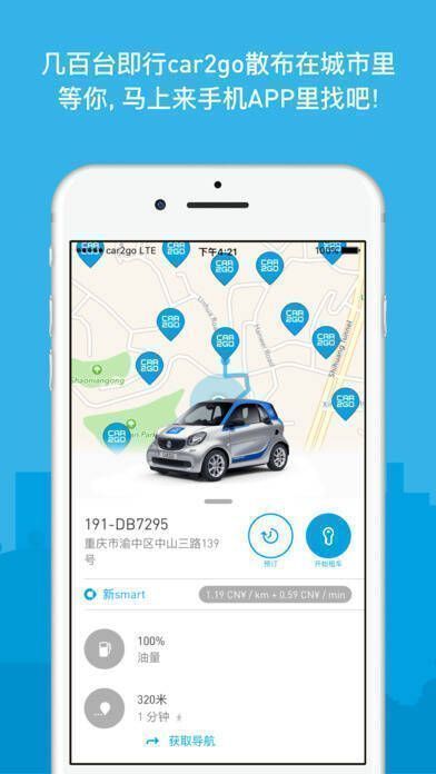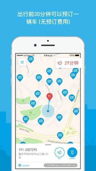 你既可以在app中选择一辆附近的车直接开走,也能选择最多不超过30分钟的提前预约服务。