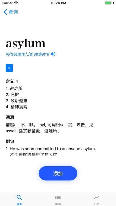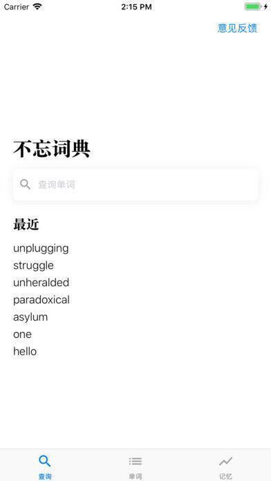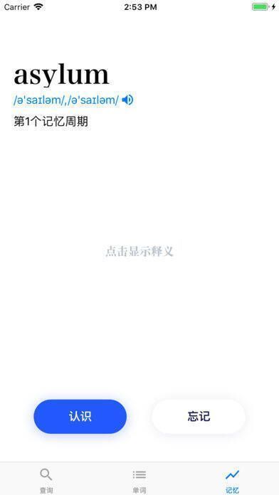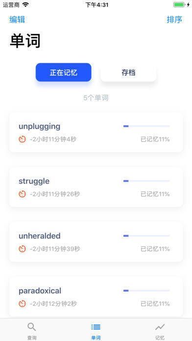 这是一款实用的单词记忆应用,通过提供词根词缀助你理解单词,运用遗忘曲线循环记忆帮你牢记单词。其记忆算法源自新东方《17天搞定GRE单词》一书,会在5分钟、30分钟、12小时、1天、2天、4天、7天和15天的时候提醒你复习单词,效果显著。通过科学的遗忘曲线循环记忆,让你深刻记忆单词,高效且不易遗忘。