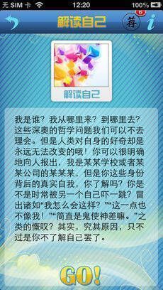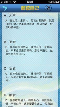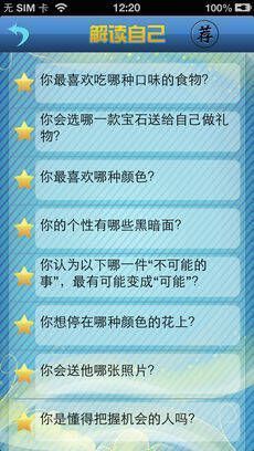 3、本游戏涵盖三大类、200多道测试题目,全方位帮你认识自己。