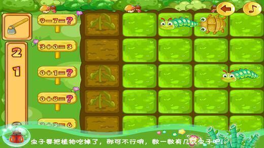 这是一款将数学与种菜相结合的游戏,小朋友通过答对题目来获取种植植物的方法和消灭虫子的道具。宝宝除草、播种、浇水,菜地里一片生机勃勃。哎呀!好多毛毛虫爬来了,快拿起杀虫剂保卫菜园子。学习内容方面,小朋友通过答对10以内的加减法题目进行游戏,从游戏模式入手,让枯燥的数学题变得充满乐趣,感受数学魅力,享受玩中学的快乐。