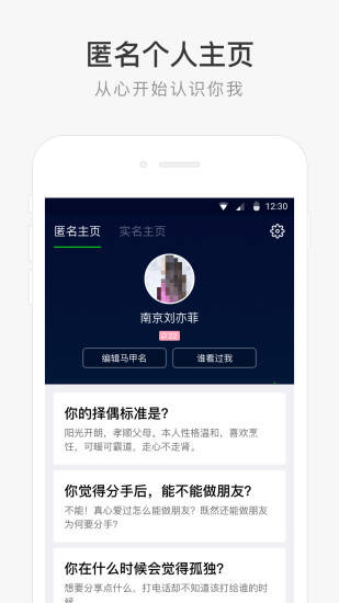 【匿名聊天】除实名社交,还有匿名聊天功能,到朋友主页点击即可匿名畅聊。