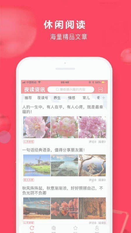 夜读资讯 app 专注于为用户提供专业的生活资讯,涵盖时尚前沿内容,支持自由订阅优质内容,满足用户的阅读需求。