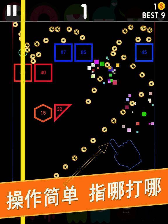 1、滑动屏幕瞄准砖块,松开手即可射击;