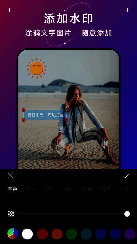 1. 自定义水印内容:可修改位置、编辑心情,水印由用户做主。