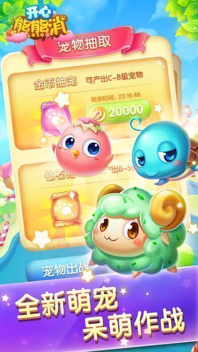 1、【全新萌宠,呆萌助战】在糖果世界收服神秘萌宠,它们拥有全屏爆破、冻结时间等多种超炫技能,让消除更刺激,和熊子带着萌宠征战糖果战场!