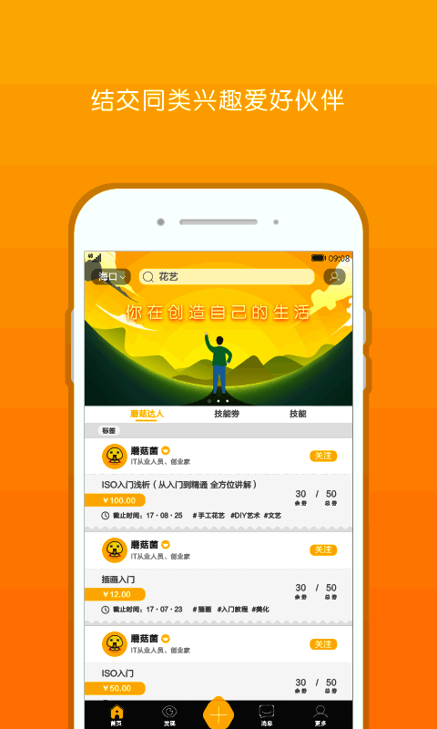 蘑菇技能作为基于社交的同城技能共享平台,有海量“技能”可发布,海量“服务”能预约;还是技能学习的“大市场”,是展示、交流、交友、分享的好去处。