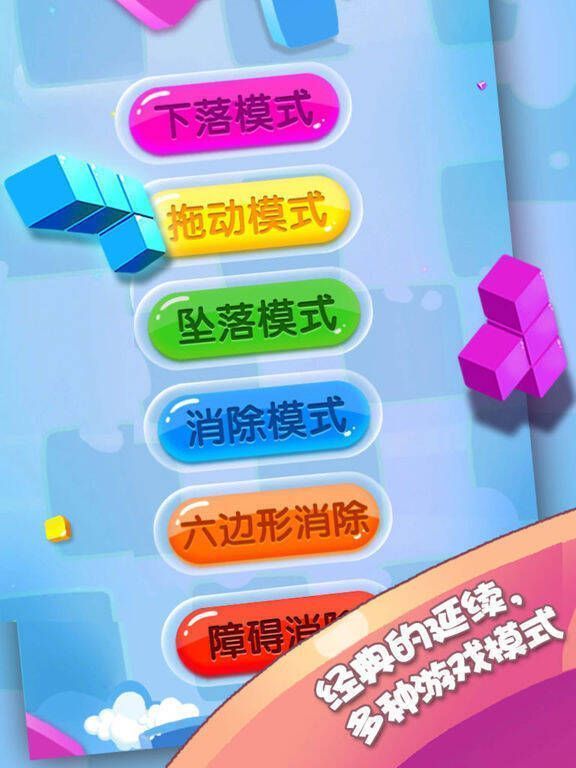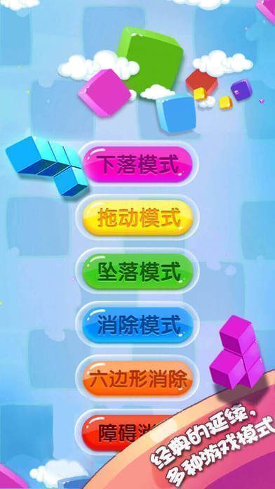 3、坠落模式:变异玩法,块块传奇升级版,用宫格旁按键改变坠落方块颜色,3个以上相同颜色方块叠放一起可消除,累计26行时游戏结束。