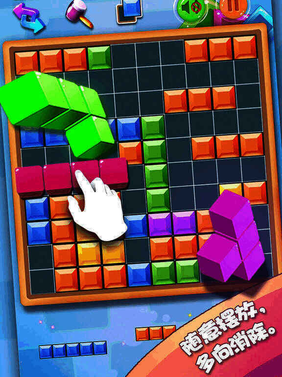 2、拖动模式:将屏幕下方三个备选方块拖入宫格,一行或一列铺满即消除,备选方块无法放置时游戏结束。