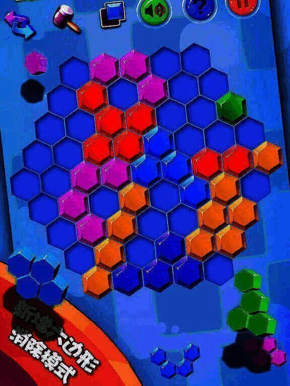 5、六边形消除:玩法比经典数独更自由,横、左斜、右斜方向都能消除得分,备选方块无法放置时游戏结束。
