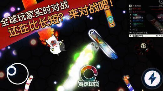 4、巧妙运用加速功能,通过“拦截”“盘踞”等操作技巧堵杀其他巨蛇,但要留意,加速会消耗自身蛇身长度。