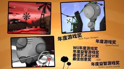 在粘粘世界里,成千上万美丽又惊人的粘粘球正充满好奇地探索着,可它们并不知道自己身处一个好玩又有趣的游戏之中。这是一款几乎拿遍所有奖项的游戏,现在玩家可以通过iPhone和iPod Touch畅玩。只需拖动那些鲜活、会爬行、还能“聊天”的粘粘球,就能搭建出塔、桥、炮弹、飞船,甚至巨大的舌头等各种奇妙结构。