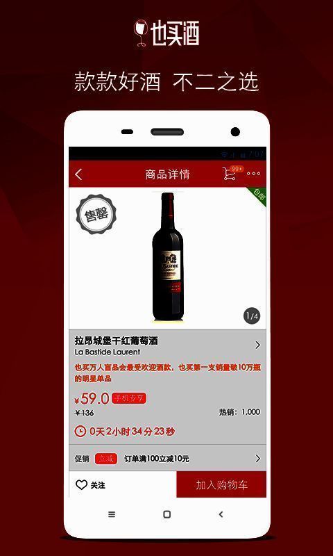 也买酒是专业的进口葡萄酒、红酒电商平台,低价销售进口葡萄酒、红酒、白酒等。拥有超 800 万订购会员,直接与海外酒庄合作,提供国外原瓶进口红酒直销。也买酒 APP 集红酒热销、品牌搜索、酒评、交友、购物等功能于一体,方便爱酒人士轻松选购美酒,其葡萄酒销量超过中酒、京东、淘宝、苏宁、酒仙网等。