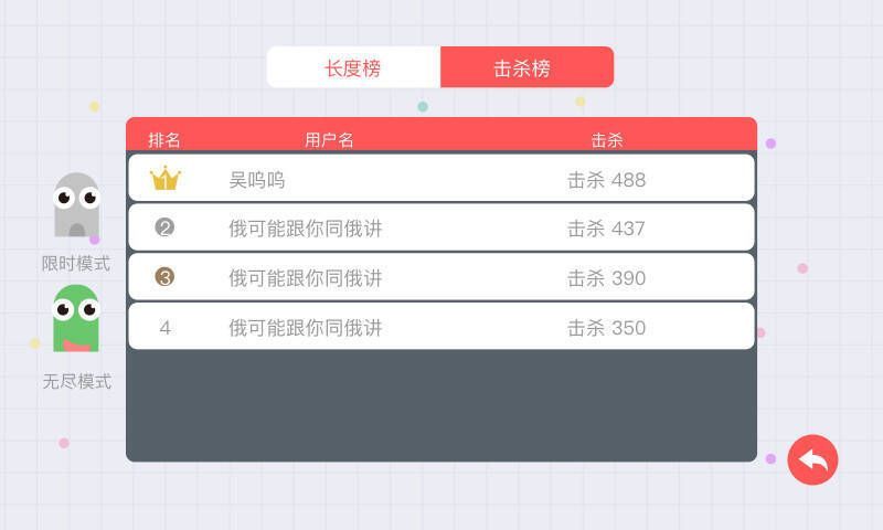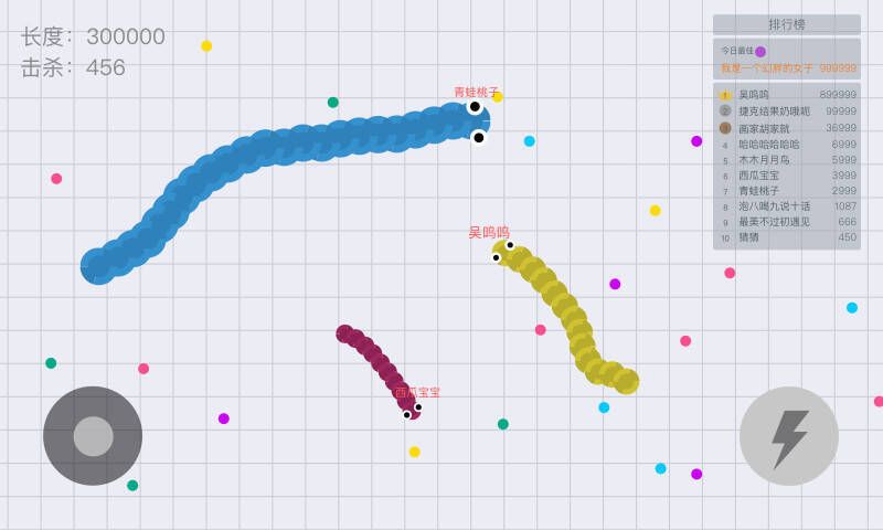 1. 控制摇杆操控小蛇,吃掉地图上的彩色小圆点,小蛇就会变长。2. 注意蛇头别碰到其他贪吃蛇,否则会死亡并产生大量小圆点。3. 长按加速键,巧妙走位让其他蛇撞上自己的蛇身,就能吃掉它们。4. 一局5分钟,和小伙伴比谁的蛇更长。