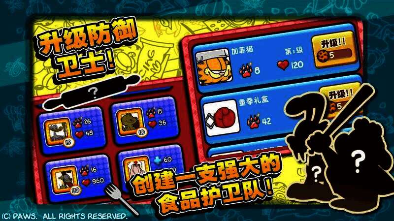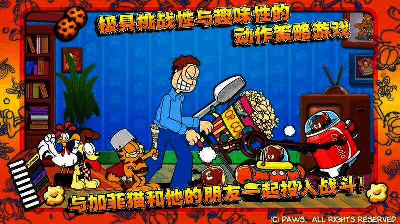 2. 加菲猫可用爆米花召集伙伴,还能吐西瓜籽攻击。点击屏幕底部工具槽使用技能和召唤伙伴,但需足够爆米花。