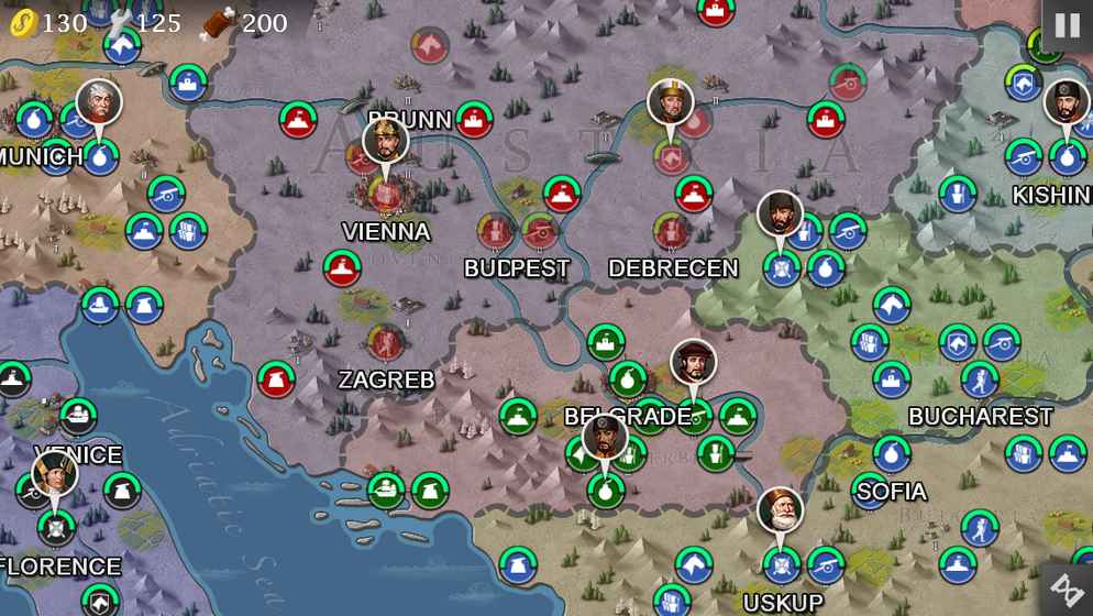 每个将领都能从列兵逐步晋升为元帅,从平民成长为皇帝。战场上的每支部队都有独特特点,若能熟练运用,便能战无不胜。部队会积累战斗经验,成为王牌部队后战斗力大幅提升。全新设计的地图系统,支持无缝缩放,各国势力范围和国界线一目了然。在战场上,除运用战术击退敌军,还能在商店购物、酒馆招募将领、市场兑换物资。