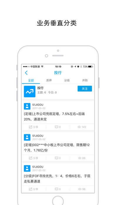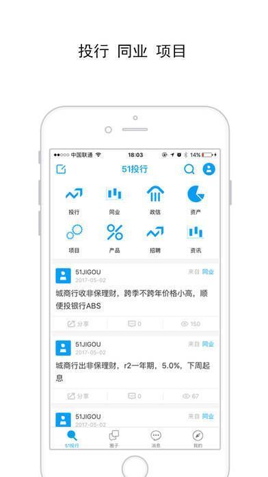 51投行 - 投行同业者汇聚之地。它打造金融机构业务经理人的社交圈,精准实现业务匹配,业务范围广泛。这是一款投资类手机软件,有最新资讯与优质项目。