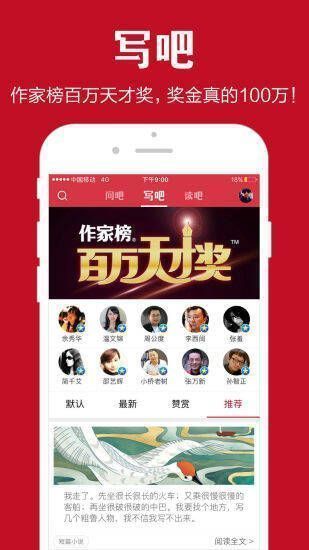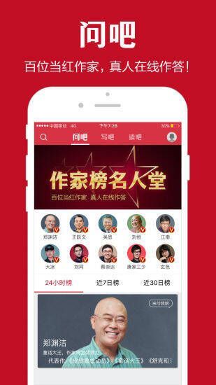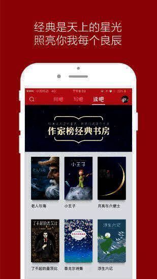 《作家榜》阅读APP是真正意义上永久免费的电子书阅读平台,每个人都能在任意时间、地点下载安装使用。这里有大量正版经典名著供用户免费畅读。它涵盖“写吧”“问吧”“聊吧”三大特色功能,在“写吧”可自由创作;“问吧”能和郑渊洁、唐家三少等当红作家真人在线互动;“聊吧”可分享读书心得。