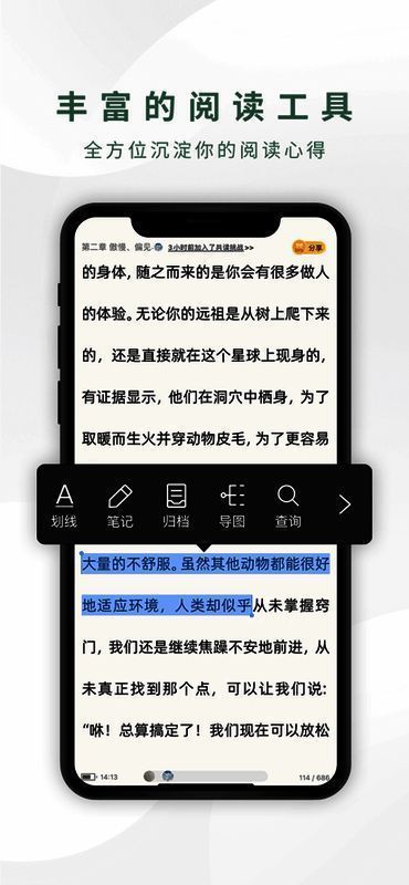 电子书阅读:读书界面精致,视觉舒适,可调节字体、背景颜色、亮度和翻页效果等,夜间模式还能保护视力。操作便捷,体验细腻,长按屏幕就能实现对文字的复制、归档、批注、高亮、字典、分享等操作。