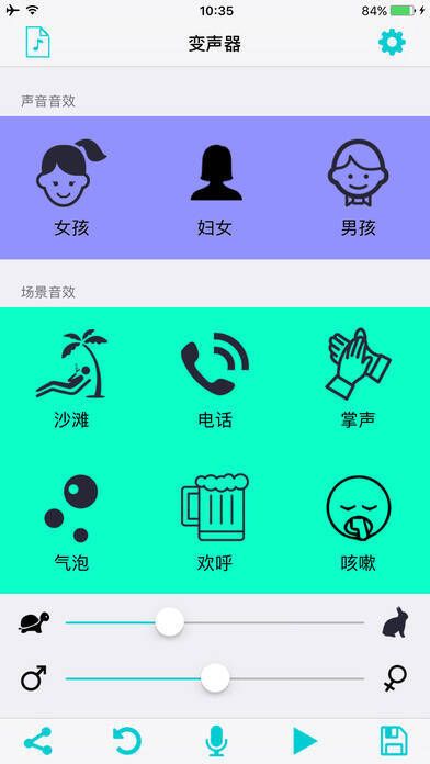 声音音效包括女孩、妇女、男孩、男人、恶魔、女鬼、慢速、快速、机器人等;场景音效有沙滩、电话、掌声、气泡等几十种。