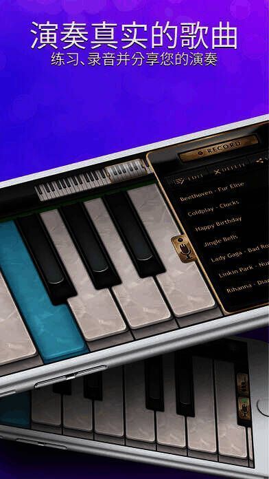 1、全 88 键钢琴键盘;2、8 种不同的钢琴键盘和乐器,如钢琴键盘、早期钢琴键盘等;3、单双滚动键盘;4、免费钢琴曲子;5、钢琴音符教师;6、钢琴练习模式;7、免费钢琴课程;8、流行和经典钢琴曲;9、记录功能,可记录并分享成果。