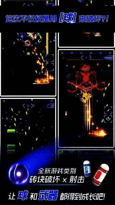 不再只用球破坏砖块,打砖块游戏迈入新时代,实现砖块破坏与射击游戏的跨越融合,可使用强力道具进行战略性成长。