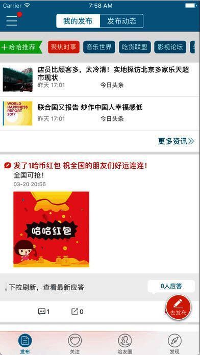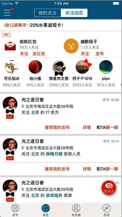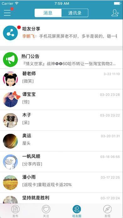 3、随时线上畅沟通——任意双方都能交流,商家、陌生人、粉丝、哈友等按类分群,交流方便快捷。