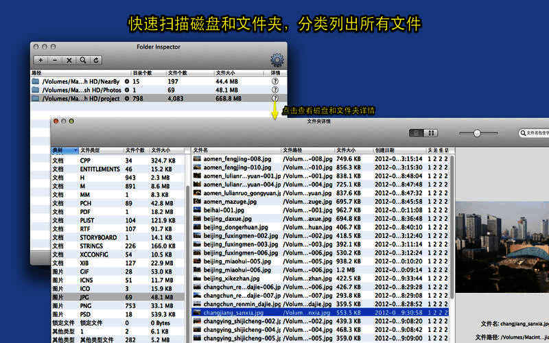 2. 迅速计算出每种类型文件的数量和占用磁盘大小。