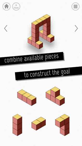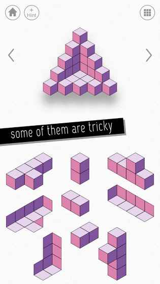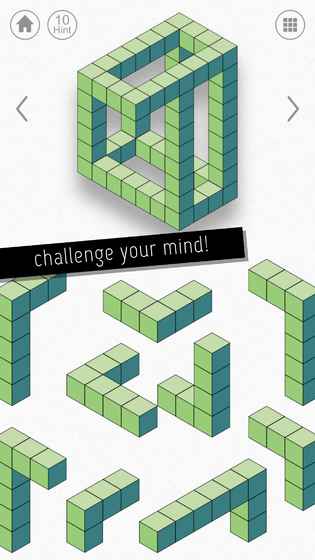 1、此游戏玩法类似拼图,不过是3D立体版。虽看似比普通拼图简单,但对立体思维欠佳的人而言,难度更大。